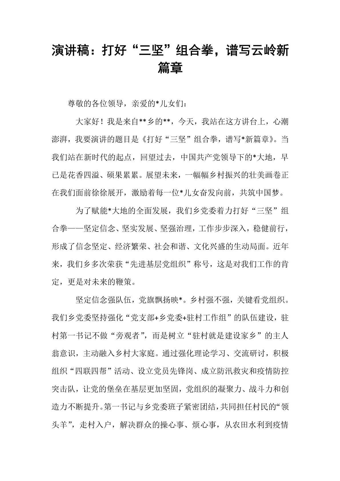 演講稿:打好“三堅”組合拳,譜寫云嶺新篇章尊敬的各位領導,親愛的*兒女們:大家好!我是來自**鄉(xiāng)的**,今天,我站在這方講臺上,心潮澎湃,我要演講的題目是《打好“三堅”組合拳,譜寫*新篇章》。當我們站在新時代的起點,回望過去,中國共產黨領導下的*大地,早已是花香四溢、碩果累累。展望未來,一幅幅鄉(xiāng)村振興的壯美畫卷正在我們面前徐徐展開,激勵著每一位*兒女奮發(fā)向前,共筑中國夢。為了賦能*大地的全面發(fā)展,我們鄉(xiāng)黨委著力打好“三堅”組合拳——堅定信念、堅實發(fā)展、堅強治理,工作步步深入,穩(wěn)健前行,形成了信念堅定、經濟繁榮、社會和諧、文化興盛的生動局面。近年來,我們鄉(xiāng)多次榮獲“先進基層黨組織”稱號,這是對我...