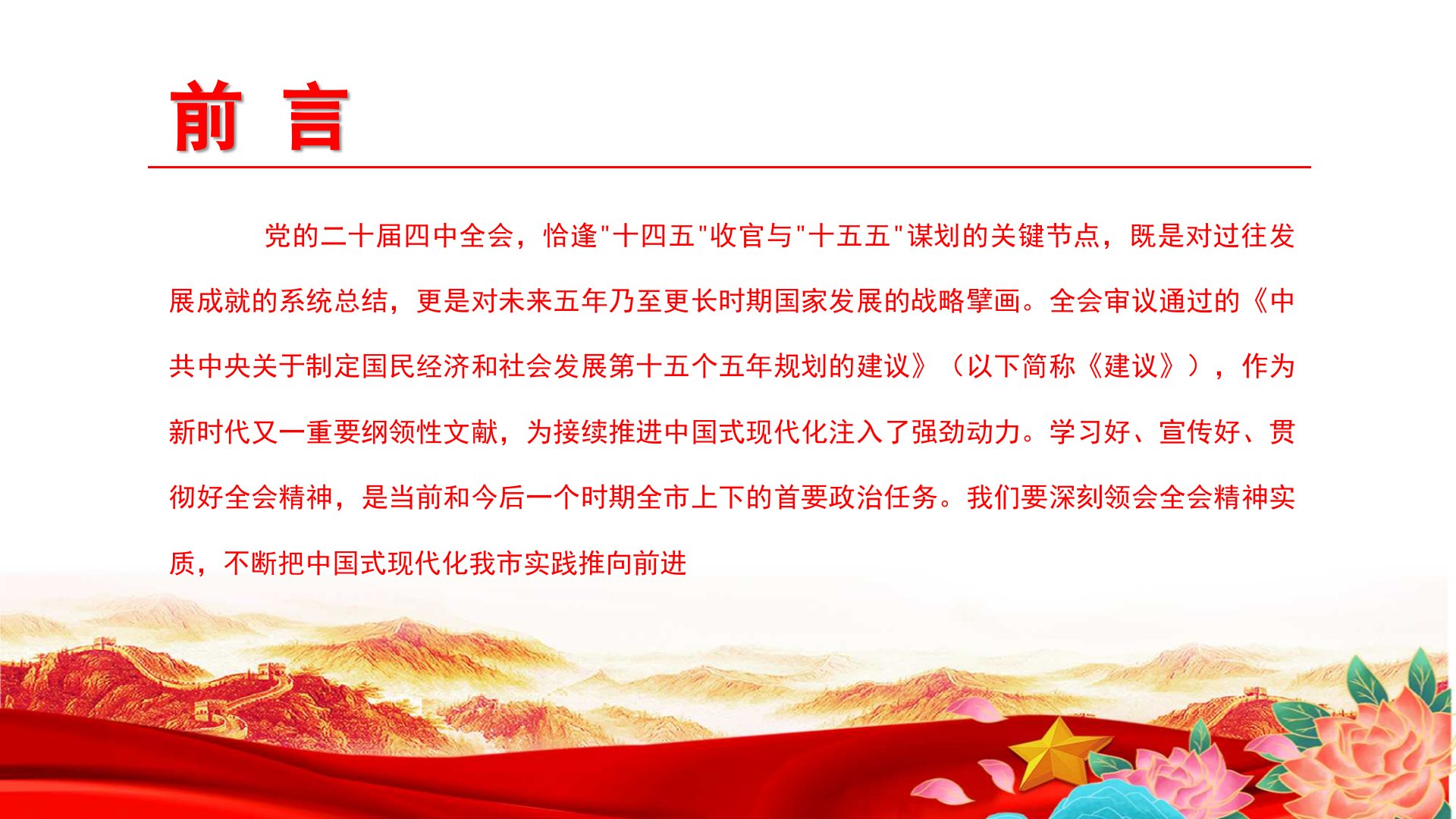匯報人:習近平深刻學習領(lǐng)會二十屆四中全會精神,不斷把中國式現(xiàn)代化我市實踐推向前進前言黨的二十屆四中全會,恰逢"十四五"收官與"十五五"謀劃的關(guān)鍵節(jié)點,既是對過往發(fā)展成就的系統(tǒng)總結(jié),更是對未來五年乃至更長時期國家發(fā)展的戰(zhàn)略擘畫。全會審議通過的《中共中央關(guān)于制定國民經(jīng)濟和社會發(fā)展第十五個五年規(guī)劃的建議》(以下簡稱《建議》),作為新時代又一重要綱領(lǐng)性文獻,為接續(xù)推進中國式現(xiàn)代化注入了強勁動力。學習好、宣傳好、貫徹好全會精神,是當前和今后一個時期全市上下的首要政治任務(wù)。我們要深刻領(lǐng)會全會精神實質(zhì),不斷把中國式現(xiàn)代化我市實踐推向前進目錄CONTENTS一、深刻領(lǐng)會黨的二十屆四中全會精神實質(zhì)二、以全會精神...