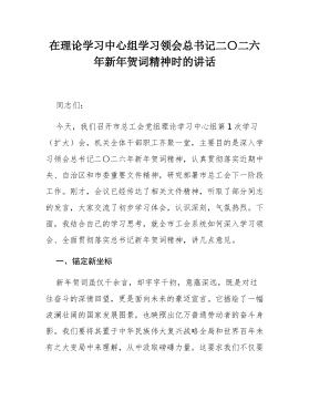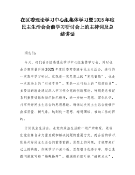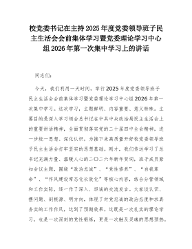 校黨委書記在主持2025年度黨委領(lǐng)導班子民主生活會會前集體學習暨黨委理論學習中心組2026年第一次集中學習上的講話同志們:今天,我們利用一天時間,舉行2025年度黨委領(lǐng)導班子民主生活會會前集體學習暨黨委理論學習中心組2026年第一次集中學習。這次學習,主題鮮明、內(nèi)容重要、意義特殊。主要目的是深入學習領(lǐng)會總書記在中共中央政治局民主生活會上的重要講話精神,全面貫徹落實黨的二十屆四中全會精神,進一步統(tǒng)一思想、深化認識,為接下來高質(zhì)量開好校黨委領(lǐng)導班子民主生活會打牢堅實的思想基礎(chǔ)。剛才,我們傳達學習了總書記充滿力量、溫暖人心的二〇二六年新年賀詞,班子成員緊扣會議主題,圍繞“政治忠誠”、“黨性修養(yǎng)”、“...
