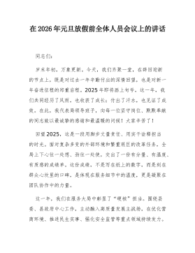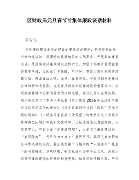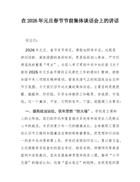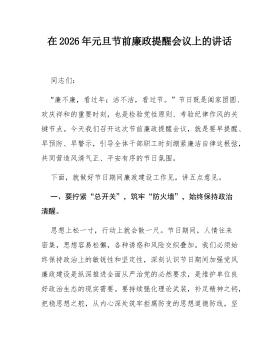 在2026年“元旦”節(jié)前廉政談話暨安全部署工作會議講話同志們:大家好!冬去春來,時光如白駒過隙。我們即將揮別披荊斬棘、成果豐碩的2025年,邁進滿懷憧憬、蓄勢待發(fā)的2026年。在這辭舊迎新的關鍵當口,我們特意召開此次會議,既是一次節(jié)前的廉政警鐘長鳴,也是一場全面的安全工作部署。核心目的在于引導大家進一步繃緊“廉潔之弦”、擰緊“安全閥門”,確保每一位同志都能度過一個歡樂祥和、風清氣正的元旦佳節(jié),更為新一年的工作開好局、起好步筑牢堅實的思想與行動根基。節(jié)點就是“考點”,越是節(jié)假日,越能檢驗我們的作風與擔當。期望通過今天的會議,讓大家在思想上再受洗禮、在精神上再添動力、在工作上再鼓干勁,以清廉守紀的...