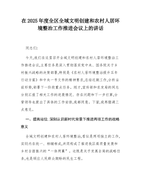 在2025年度全區(qū)全域文明創(chuàng)建和農(nóng)村人居環(huán)境整治工作推進(jìn)會(huì)議上的講話同志們:今天,我們?cè)谶@里召開全域文明創(chuàng)建和農(nóng)村人居環(huán)境整治工作推進(jìn)會(huì)議,主要任務(wù)是深入貫徹落實(shí)黨中央、國(guó)務(wù)院關(guān)于鄉(xiāng)村振興戰(zhàn)略的決策部署,特別是《農(nóng)村人居環(huán)境整治提升五年行動(dòng)方案》和中央一號(hào)文件的精神要求,總結(jié)近期工作,分析當(dāng)前形勢(shì),部署下一階段重點(diǎn)任務(wù)。剛才,宣傳部和農(nóng)發(fā)局的同志分別匯報(bào)了相關(guān)工作的進(jìn)展情況、存在問(wèn)題和下一步打算,分管領(lǐng)導(dǎo)也提出了具體的工作安排,我都同意。下面,我再?gòu)?qiáng)調(diào)三點(diǎn)意見。一、提高站位,深刻認(rèn)識(shí)新時(shí)代背景下推進(jìn)兩項(xiàng)工作的戰(zhàn)略意義全域文明創(chuàng)建和農(nóng)村人居環(huán)境整治,看似是兩項(xiàng)獨(dú)立的工作,實(shí)則內(nèi)在統(tǒng)一、相輔相成,...