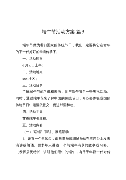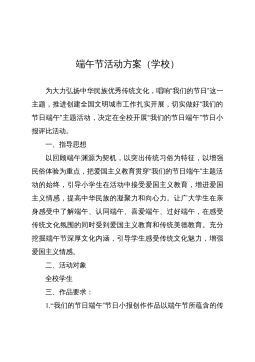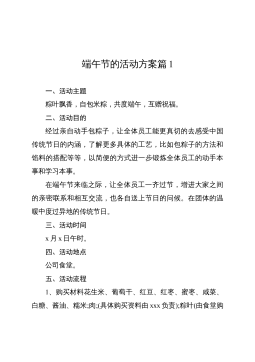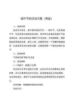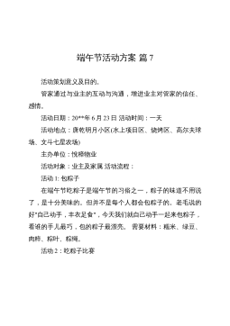 端午節(jié)活動方案篇7活動策劃意義及目的。管家通過與業(yè)主的互動與溝通,增進業(yè)主對管家的信任、感情。活動日期:20**年6月23日活動時間:一天活動地點:唐乾明月小區(qū)(水上項目區(qū)、燒烤區(qū)、高爾夫球場、文斗七星農(nóng)場)主辦單位:悅樟物業(yè)活動對象:業(yè)主及家屬活動流程:活動1:包粽子在端午節(jié)吃粽子是端午節(jié)的習(xí)俗之一,粽子的味道不用說了,是十分美味的。但并不是每個人都會包粽子的。老毛說的好"自己動手,豐衣足食",今天我們就自己動手一起來包粽子,看誰的手兒最巧,包的粽子最漂亮。需要材料:糯米、綠豆、肉粹、粽葉、粽繩?;顒?:吃粽子比賽參賽者以三人為一組,蒙好雙眼,待主持人宣布"開始"后,各參賽選手在原地轉(zhuǎn)五圈,...