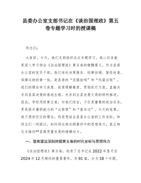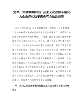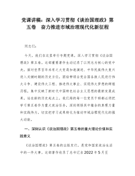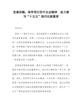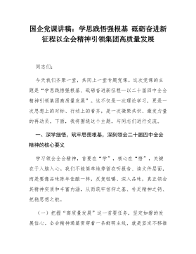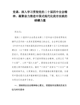 黨課講稿:錨定“十五五”戰(zhàn)略航向勇?lián)鷩笫姑V寫高質(zhì)量發(fā)展新篇同志們:今天,我們在這里舉行專題黨課,深入學習貫徹黨的二十屆四中全會精神,共同探討新征程上國資國企如何更好地錨定“十五五”戰(zhàn)略航向,勇?lián)鷷r代使命,以高質(zhì)量發(fā)展譜寫新的篇章。黨的二十屆四中全會是在全面建設社會主義現(xiàn)代化國家、向第二個百年奮斗目標進軍的關鍵時刻召開的一次具有里程碑意義的會議。全會精神博大精深、內(nèi)涵豐富,是國資國企推進改革發(fā)展和黨建工作的根本遵循和行動指南。國有企業(yè)作為中國特色社會主義經(jīng)濟的“頂梁柱”和“壓艙石”,必須提高政治站位,深刻領會全會作出的重大戰(zhàn)略部署,特別是對國有經(jīng)濟布局優(yōu)化、結構調(diào)整、科技創(chuàng)新、深化改革等方面...