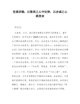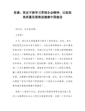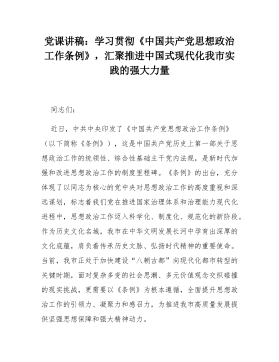 黨課講稿:學(xué)習(xí)貫徹《中國共產(chǎn)黨思想政治工作條例》,匯聚推進中國式現(xiàn)代化我市實踐的強大力量同志們:近日,中共中央印發(fā)了《中國共產(chǎn)黨思想政治工作條例》(以下簡稱《條例》),這是中國共產(chǎn)黨歷史上第一部關(guān)于思想政治工作的統(tǒng)領(lǐng)性、綜合性基礎(chǔ)主干黨內(nèi)法規(guī),是新時代加強和改進思想政治工作的制度里程碑。《條例》的出臺,充分體現(xiàn)了以同志為核心的黨中央對思想政治工作的高度重視和深遠謀劃,標(biāo)志著我們黨在推進國家治理體系和治理能力現(xiàn)代化進程中,思想政治工作邁入科學(xué)化、制度化、規(guī)范化的新階段。作為歷史文化名城,我市在中華文明發(fā)展長河中孕育出深厚的文化底蘊,肩負著傳承歷史文脈、弘揚時代精神的重要使命。當(dāng)前,我市正處于加快...