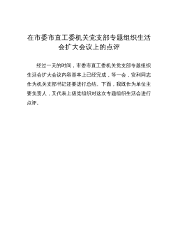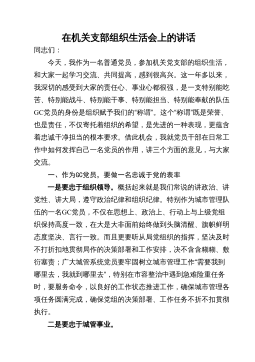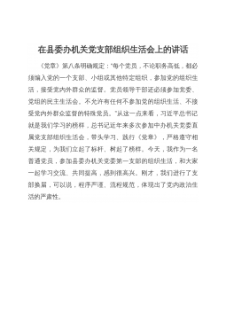 在市委辦公室機(jī)關(guān)黨支部組織生活會(huì)上的講話發(fā)言同志們:今天,很高興以一名普通黨員的身份參加市委辦公室機(jī)關(guān)黨支部組織生活會(huì),和大家談?wù)勑?,交流一下思想、學(xué)習(xí)和工作上的體會(huì)。市委辦公室作為“前哨”“中樞”"后院",處于服務(wù)發(fā)展的最前沿、服務(wù)領(lǐng)導(dǎo)的最前沿、服務(wù)群眾的最前沿,更需要大家在各項(xiàng)工作中都沖鋒在前、率先垂范。今年以來在與辦公室同志們朝夕相處、并肩戰(zhàn)斗的日子里,我由衷地感到辦公室這個(gè)集體有戰(zhàn)斗力、有正能量,大家講政治、講大局、講奉獻(xiàn),有效推動(dòng)了市委決策部署的貫徹落實(shí)。特別是我注意到,在座的年輕同志不少,整支隊(duì)伍給人的感覺朝氣蓬勃、充滿活力。平時(shí)因?yàn)楣ぷ髅?,我參加支部活?dòng)不是很經(jīng)常,與同志們的溝通...