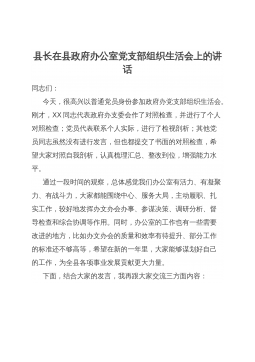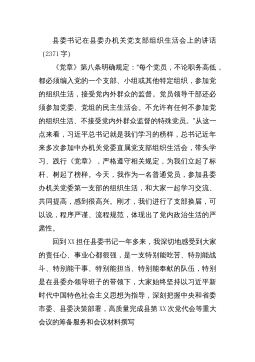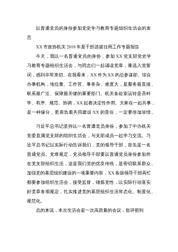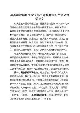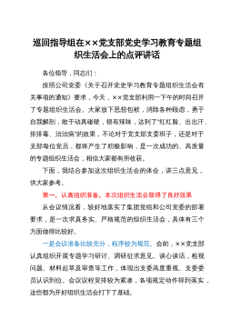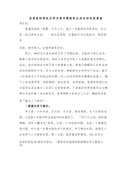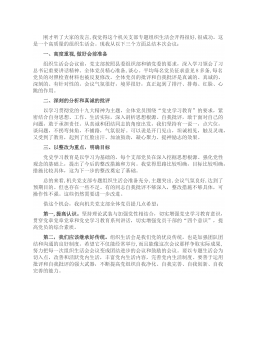 剛才聽(tīng)了大家的發(fā)言,我覺(jué)得這個(gè)機(jī)關(guān)支部專(zhuān)題組織生活會(huì)開(kāi)得很好,很成功。這是一個(gè)高質(zhì)量的組織生活會(huì)?,F(xiàn)我從以下三個(gè)方面總結(jié)本次會(huì)議:一、高度重視,做好會(huì)前準(zhǔn)備組織生活會(huì)會(huì)議前,黨支部按照縣委組織部和鎮(zhèn)黨委的要求,深入學(xué)習(xí)領(lǐng)會(huì)了習(xí)總書(shū)記重要講話精神。全體黨員精心準(zhǔn)備,談心。平均每名黨員征求意見(jiàn)8多條,每名黨員的對(duì)照檢查材料也被反復(fù)修改。全體黨員的批評(píng)和自我批評(píng)是真誠(chéng)的、真誠(chéng)的、深刻的、有針對(duì)性的。會(huì)議氣氛很好,境界很好,真正起到了排汗、排毒、紅臉、心跳的作用。二、深刻的分析和真誠(chéng)的批評(píng)以學(xué)習(xí)貫徹黨的十九大精神為主題,全體黨員圍繞“黨史學(xué)習(xí)教育”的要求,緊密結(jié)合自身思想、工作、生活實(shí)際,深入剖析思想...