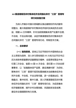 xx鎮(zhèn)清理規(guī)范農(nóng)村集體經(jīng)濟(jì)合同強(qiáng)化農(nóng)村“三資”管理專項行動實施方案為深入開展鄉(xiāng)村振興領(lǐng)域群眾身邊腐敗和作風(fēng)問題專項整治,最大程度維護(hù)農(nóng)村集體經(jīng)濟(jì)組織及其成員合法權(quán)益,根據(jù)xx文件精神,針對當(dāng)前我鎮(zhèn)集體資產(chǎn)處置不合理、不合規(guī)、不合法等問題,決定開展清理規(guī)范農(nóng)村集體經(jīng)濟(jì)合同強(qiáng)化農(nóng)村“三資”管理專項行動,特制定本方案。一、總體要求(一)指導(dǎo)思想。堅持以習(xí)近平新時代中國特色社會主義思想為指導(dǎo),深入學(xué)習(xí)貫徹黨的XX大和習(xí)近平總書記歷次來陜考察重要講話重要指示精神,全面貫徹落實中央紀(jì)委二次全會、省委xx屆xx次全會、縣紀(jì)委xx次全會部署要求,以“加強(qiáng)集體資產(chǎn)監(jiān)管,建設(shè)清廉村居”為目標(biāo),聚焦農(nóng)村“三資”管理...