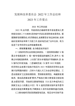 發(fā)展和改革委員會(huì)2022年工作總結(jié)和2023年工作要點(diǎn)2022年工作總結(jié)2022年,在市委、市政府的正確領(lǐng)導(dǎo)某市發(fā)改委深入貫徹落實(shí)黨的二十大精神,堅(jiān)持穩(wěn)中求進(jìn)總基調(diào)和新發(fā)展理念,緊緊圍繞“疫情要防住,經(jīng)濟(jì)要穩(wěn)住,發(fā)展要安全”的總體目標(biāo),統(tǒng)籌做好發(fā)展和改革兩個(gè)方面工作,較好地完成了全年任務(wù),有力促進(jìn)了全市經(jīng)濟(jì)社會(huì)持續(xù)健康發(fā)展。一、抓統(tǒng)籌重調(diào)度,全力穩(wěn)定經(jīng)濟(jì)運(yùn)行(一)抓好經(jīng)濟(jì)社會(huì)發(fā)展總體謀劃。一是統(tǒng)籌協(xié)調(diào)好X項(xiàng)重點(diǎn)專項(xiàng)規(guī)劃和X項(xiàng)一般專項(xiàng)規(guī)劃的編制工作,其中,X項(xiàng)重點(diǎn)專項(xiàng)規(guī)劃除商務(wù)、人社部門牽頭專項(xiàng)因故不再編制外,其余X項(xiàng)均已印發(fā)實(shí)施。二是編制完成《X某市2022年國民經(jīng)濟(jì)和社會(huì)發(fā)展計(jì)劃執(zhí)行情況與2...