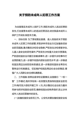 關(guān)于預(yù)防未成年人犯罪工作方案 為全面落實(shí)未成年人保護(hù)工作,預(yù)防未成年人違法犯罪的發(fā)生,打擊侵害未成年人的違法犯罪活動(dòng),結(jié)合我縣未成年人保護(hù)工作實(shí)際,制定本方案?!∫?、目標(biāo)任務(wù)為了貫徹落實(shí)縣委、縣人民政府關(guān)于預(yù)防未成年人犯罪工作的部署,采取多種手段全方位加強(qiáng)各項(xiàng)安全防范措施,重點(diǎn)整改涉校安全隱患,嚴(yán)防發(fā)生涉校侵害學(xué)生、兒童人身安全的惡性案件;嚴(yán)防發(fā)生涉校重大治安災(zāi)害事故,嚴(yán)防因校園安全問(wèn)題引發(fā)敏感事件;進(jìn)一步提升涉校事件打擊預(yù)防能力,進(jìn)一步提升校園內(nèi)部安全防范水平;進(jìn)一步推進(jìn)校園及周邊治安防控體系建設(shè),進(jìn)一步推進(jìn)校園安全常態(tài)化警務(wù)運(yùn)行機(jī)制建設(shè)。切實(shí)維護(hù)校園及周邊社會(huì)治安穩(wěn)定,增強(qiáng)廣大人民群眾安全...