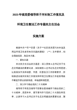 2023年鎮(zhèn)黨委領(lǐng)導(dǎo)班子河長制工作落實(shí)及環(huán)境衛(wèi)生整治工作專題民主生活會實(shí)施方案 根據(jù)中共**市**區(qū)委《關(guān)于**社區(qū)排洪渠污水外溢及周邊環(huán)境衛(wèi)生差等有關(guān)問題的通報(bào)》(**)文件要求,結(jié)合我鎮(zhèn)實(shí)際,制定本方案?! ∫?、緊扣主題 本次民主生活會的主題是:深入貫徹A總書記關(guān)于生態(tài)文明建設(shè)的重要論述,深刻領(lǐng)悟A總書記生態(tài)文明思想,認(rèn)真落實(shí)中央和省委、市委、區(qū)委創(chuàng)衛(wèi)工作部署要求,持續(xù)推進(jìn)全鎮(zhèn)河長制工作落實(shí)和環(huán)境衛(wèi)生整治工作提質(zhì)增效不斷提升群眾的獲得感、幸福感和滿意度?! 《⑸钊雽W(xué)習(xí)領(lǐng)會黨的二十大精神 領(lǐng)導(dǎo)班子和黨員領(lǐng)導(dǎo)干部要全面準(zhǔn)確學(xué)習(xí)領(lǐng)會黨的二十大精神,原原本本、逐字逐句學(xué)習(xí)黨的二十大報(bào)告和黨...