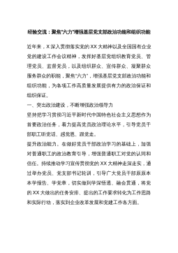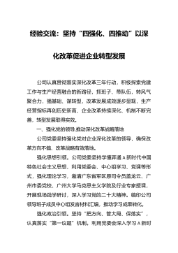 公司深化改革經(jīng)驗交流:堅持“四強化、四推動”促進企業(yè)轉(zhuǎn)型發(fā)展公司認真貫徹落實深化改革三年行動,積極探索黨建工作與生產(chǎn)經(jīng)營融合的新路徑,抓班子、帶隊伍,轉(zhuǎn)風氣聚合力,強基礎、謀轉(zhuǎn)型,改革發(fā)展成效逐步顯現(xiàn),生產(chǎn)經(jīng)營指標再創(chuàng)歷史新高、企業(yè)改革持續(xù)深化、機制不斷完善,轉(zhuǎn)型發(fā)展取得實效。一、強化D的領導,推動深化改革戰(zhàn)略落地公司D委堅持強化D對企業(yè)深化改革的領導,確保改革方向不偏、改革戰(zhàn)略有效落地。強化思想引領。公司D委堅持學懂弄通新時代中國特色社會主義思想,利用D委會、中心組學習、D課等形式,強化理論學習,邀請廣東省軍區(qū)原司令員蓋龍云、廣州市委D校、廣州大學馬克思主義學院及行業(yè)專家授課,開展現(xiàn)場踐學研...
