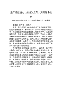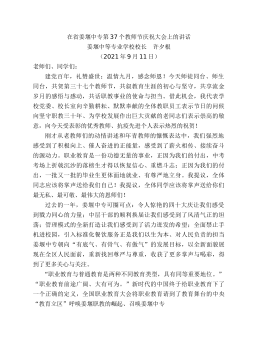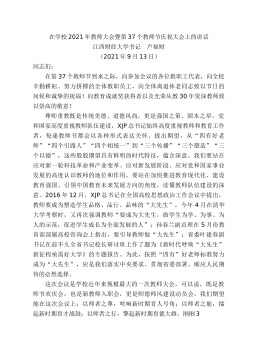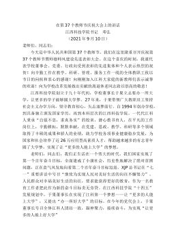 在學(xué)校2021年教師大會暨第37個教師節(jié)慶祝大會上的講話江西財(cái)經(jīng)大學(xué)書記盧福財(cái)(2021年9月13日)同志們:在第37個教師節(jié)到來之際,向參加會議的各位教職工代表,向全校辛勤耕耘、努力拼搏的全體教職員工,向全體離退休老同志致以節(jié)日的問候和誠摯的祝福!向教育成就獎獲得者以及光榮從教30年資深教師致以崇高的敬意!尊師重教既是傳統(tǒng)美德、道德風(fēng)尚,更是強(qiáng)國之策、固本之舉。黨和國家高度重視教師隊(duì)伍建設(shè),習(xí)近平總書記始終高度重視教師和教育工作者,每逢教師節(jié)都會以各種形式表達(dá)關(guān)懷、提出期望,從“四有好老師”“四個引路人”“四個相統(tǒng)一”到“三個傳播”“三個塑造”“三個以德”,這些殷殷期望具有鮮明的時代特征,蘊(yùn)...