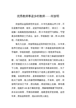 優(yōu)秀教師的先進(jìn)事跡——常文棟常文棟,男,中學(xué)一級教師,現(xiàn)任九年級物理教學(xué)工作。在教學(xué)工作中,始終堅(jiān)持認(rèn)真?zhèn)浜妹恳还?jié)課,力求上好每一節(jié)課,積極參與教研課改活動,不斷提高自己的教育教學(xué)水平,探索實(shí)踐新的教學(xué)方法,開拓創(chuàng)新,與時俱進(jìn),教育教學(xué)成績優(yōu)異。201X被評為縣級優(yōu)秀教師。一、認(rèn)真教學(xué),潛心教研。作為一名教師,我不斷地刻苦鉆研業(yè)務(wù),認(rèn)真研究教材教法,研究新課程標(biāo)準(zhǔn),注重多方位培養(yǎng)學(xué)生的能力和學(xué)習(xí)習(xí)慣,對工作講求實(shí)效,對學(xué)生因材施教。教研活動是載體,課改教研是先導(dǎo)。為此,我在所從事的教研工作中積極探索,勤于實(shí)踐,做好新課改的模范帶頭人。在這方面,我積極觀看各種教學(xué)觀摩課和報(bào)告會不斷充實(shí)自己,借鑒...
