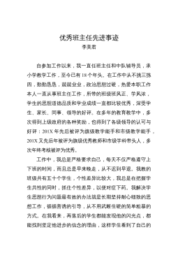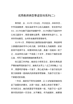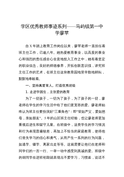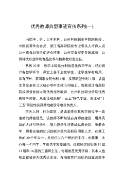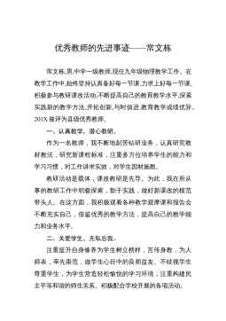 優(yōu)秀教師的先進事跡——常文棟常文棟,男,中學一級教師,現(xiàn)任九年級物理教學工作。在教學工作中,始終堅持認真?zhèn)浜妹恳还?jié)課,力求上好每一節(jié)課,積極參與教研課改活動,不斷提高自己的教育教學水平,探索實踐新的教學方法,開拓創(chuàng)新,與時俱進,教育教學成績優(yōu)異。201X被評為縣級優(yōu)秀教師。一、認真教學,潛心教研。作為一名教師,我不斷地刻苦鉆研業(yè)務,認真研究教材教法,研究新課程標準,注重多方位培養(yǎng)學生的能力和學習習慣,對工作講求實效,對學生因材施教。教研活動是載體,課改教研是先導。為此,我在所從事的教研工作中積極探索,勤于實踐,做好新課改的模范帶頭人。在這方面,我積極觀看各種教學觀摩課和報告會不斷充實自己,借鑒...