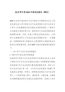 XX區(qū)審計局2025年度述法報告(精品)2025年,區(qū)審計局堅持以習近平新時代中國特色社會主義思想為指導,深入學習貫徹習近平法治思想和習近平總書記關于審計工作的重要指示批示精神,全面貫徹黨的二十屆四中全會精神,認真落實黨中央、國務院關于法治政府建設的決策部署和省委、市委、區(qū)委工作要求,堅持依法審計、文明審計,全面推進審計工作法治化,著力構建集中統(tǒng)一、全面覆蓋、權威高效的審計監(jiān)督體系,以高質量審計監(jiān)督護航全區(qū)經濟社會高質量發(fā)展?,F(xiàn)將2025年度法治建設情況報告如下:一、深入學習習近平法治思想情況(一)帶頭學習領會,筑牢思想根基堅持把學習貫徹習近平法治思想作為首要政治任務,認真學習貫徹習近平總書記...